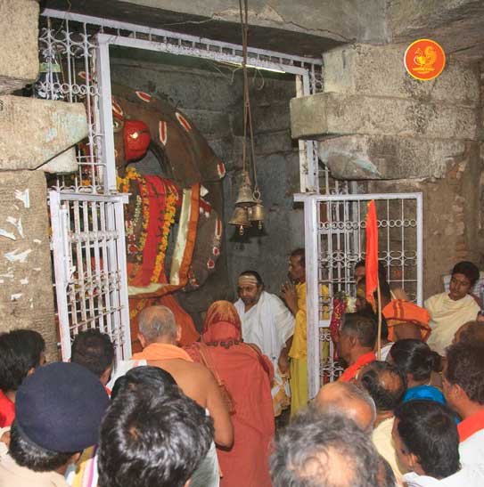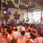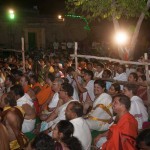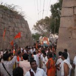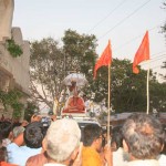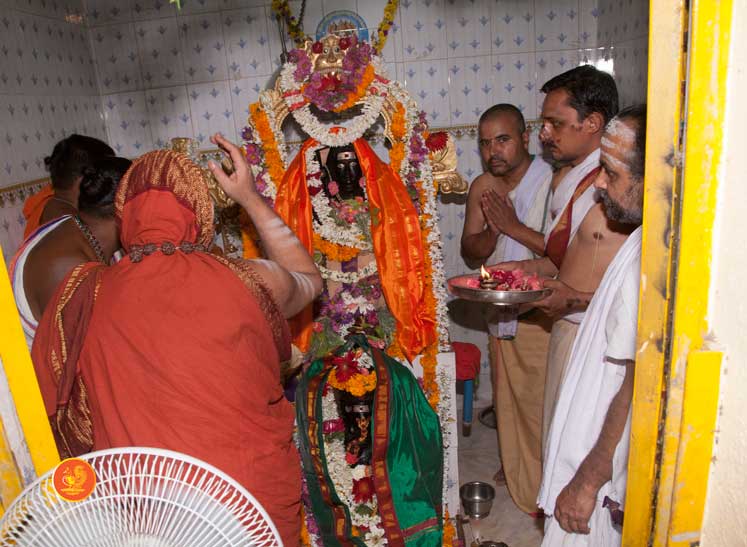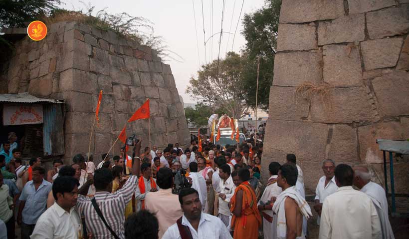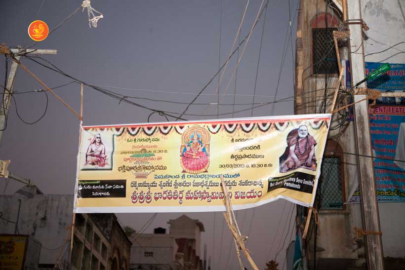 Jagadguru Shankaracharya Sri Sri Bharati Tirtha Mahaswamiji arrived at Penukonda on 29th March. The Jagadguru had Darshan of Sri Anjaneya Swamy on arrival and was led in a procession to the vicinity of the Ramabhadralayam. The Jagadguru expressed joy at being in Penukonda and blessed the devotees and performed the Sharada Chandramoulishwara Puja and the Srichakra Puja in front of the Ramabhadralayam.