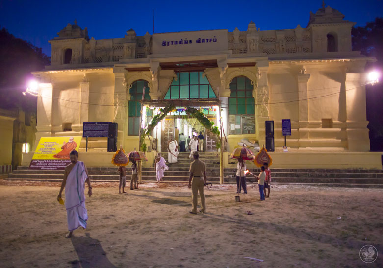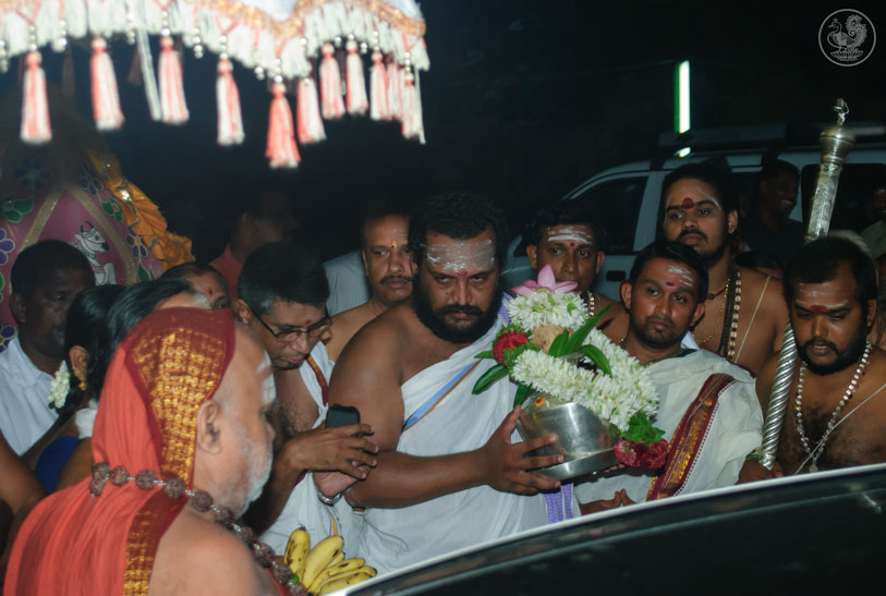 Jagadguru Shankaracharya Sri Sri Bharati Tirtha Mahaswamiji arrived at Ramanathapuram on 16th May evening to a royal reception with Poornakumbha offered by Maharani Rajarajeshwari and Sri Kumaran Sethupathy of the Ramanathapuram Samsthanam. The Jagadguru was received at the centuries-old royal hall, Sri Ramalinga Vilasam.