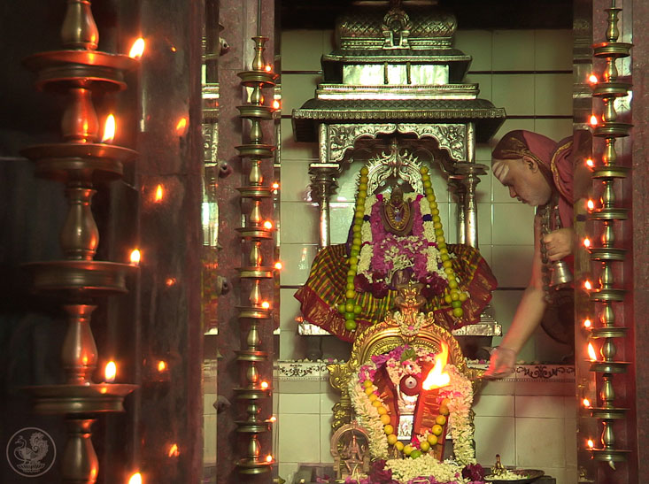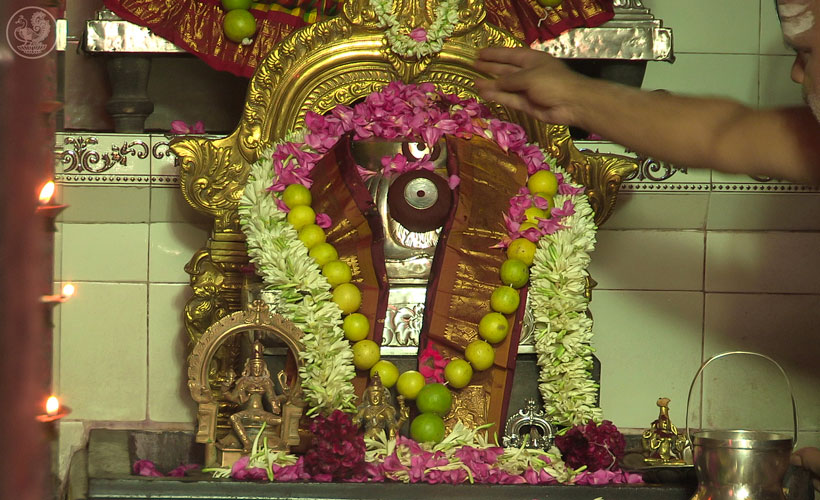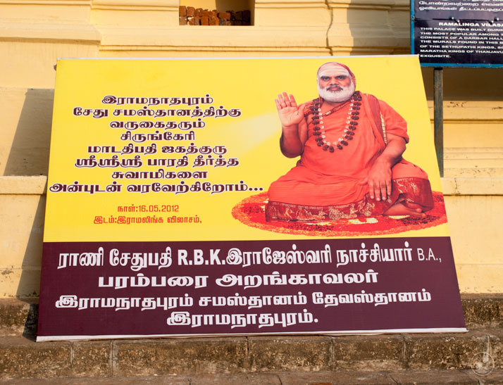 More than a century ago, the 33rd Acharya of Sringeri, Jagadguru Sri Sacchidananda Shivabhinava Narasimha Bharati Mahaswamiji was received at Ramanathapuram by the then Maharaja of Ramnad, Bhaskara Sethupati. The Mahaswamiji had noticed the ferocious aspect of the deity, Rajarajeshwari in the premises of the palace, and had made Her benign by consecrating a Srichakra and reinstalling the Goddess. He had thus put an end to the large number of animal sacrifices that were taking place in the temple at that time.
