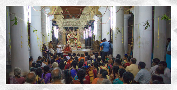 As a token of gratitude and devotion, the Samsthanam was then placed by Sri Bhaskara Sethupati at the Feet of the Guru. The Maharaja had done so with the realization that the Anugraha of the Guru is foremost in life. He knew the greatness of the Guru’s Grace, for one can even become the ruler of three worlds if one has the Grace of the Guru.