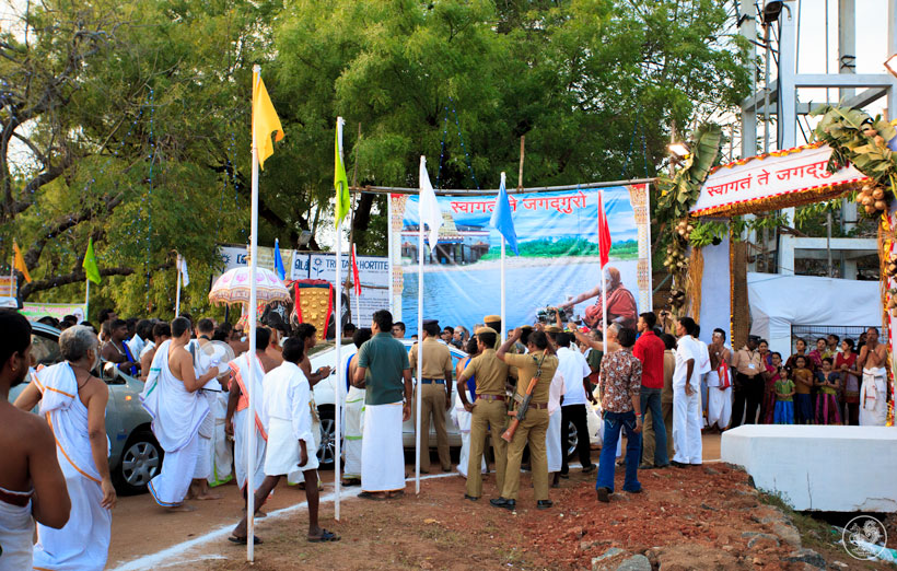 Jagadguru Shankaracharya Sri Sri Bharati Tirtha Mahaswamiji reached Ramayanpatti in the evening of 29th April, 2012. The Jagadguru first had Darshan of Lord Vinayaka in the Ramayanpatti Agrahara and was welcomed to Ramayanpatti by the descendants of late Guru Bhakta Ratnam Sri K S Krishnaswamy (Kittamani Iyer).