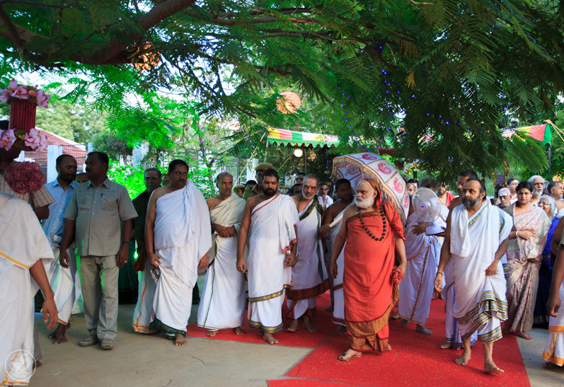 Just as the Lord is not pleased by external exhibition but by devotion, the Guru too is pleased only by true devotion. The Shastras say that देवमिव आचार्यमुपासीत – Worship the Guru as the Lord. The devotion towards the Guru will result in our Shreyas. It is natural for everyone to desire the best for oneself. This will come about only by the Grace of the Lord and the Guru. We observe Guru Bhakti even in the case of the Lord’s incarnations. The Jagadguru also mentioned that