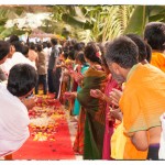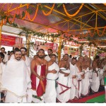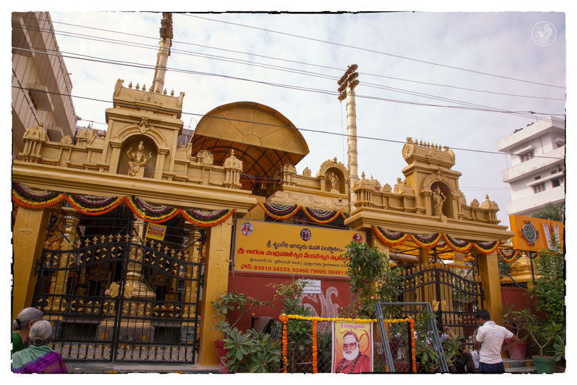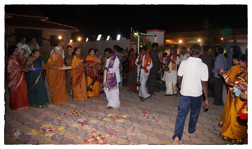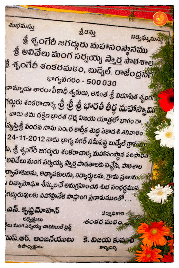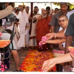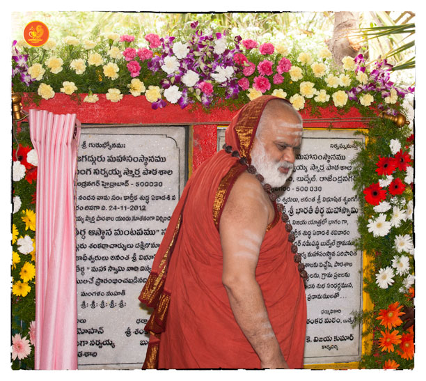On the morning of November 24th, the Jagadguru started from Shamshabad and arrived at the Sringeri Shankara Math in Rajendra Nagar. The Jagadguru was received with Poorna kumbha and the teachers and Vidyarthis of Alamelumanga Sarvayya Smarta Pathashala of the Peetham, welcomed the Jagadguru with Vedic chants. The Jagadguru then inaugurated Sri Bharati Tirtha Asthana Mandapam after which Dhuli Pada was performed.
