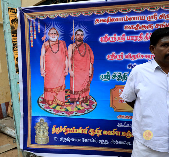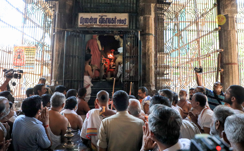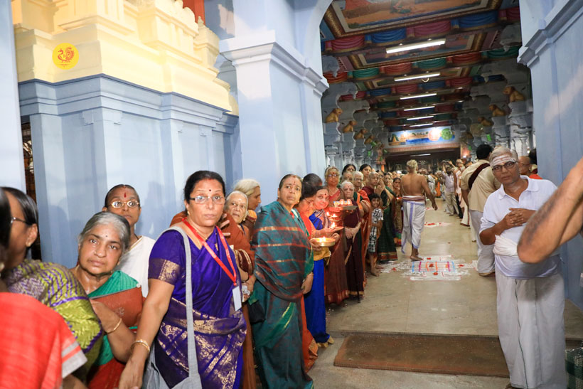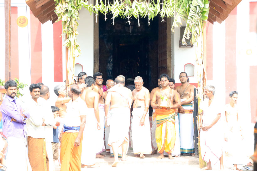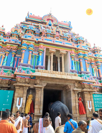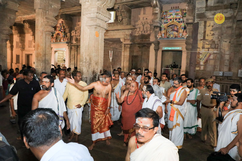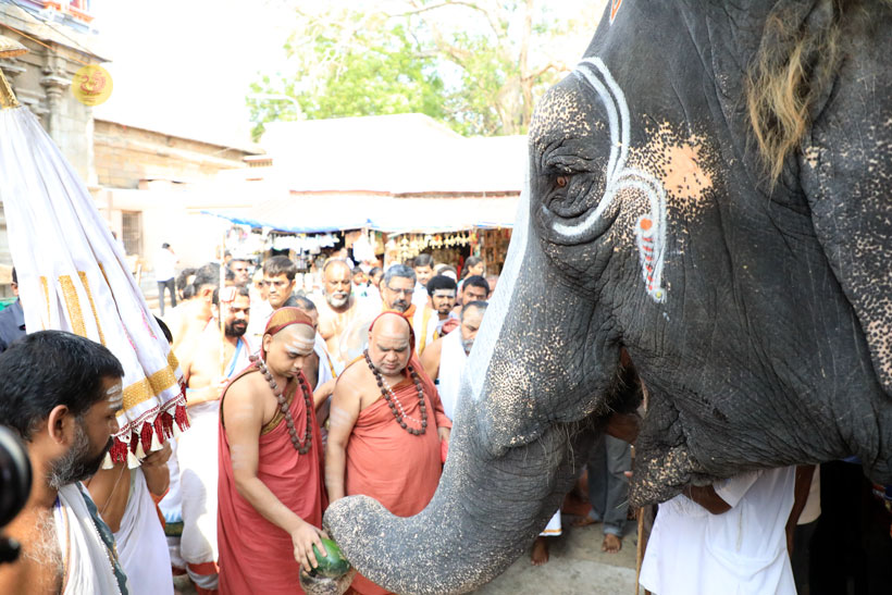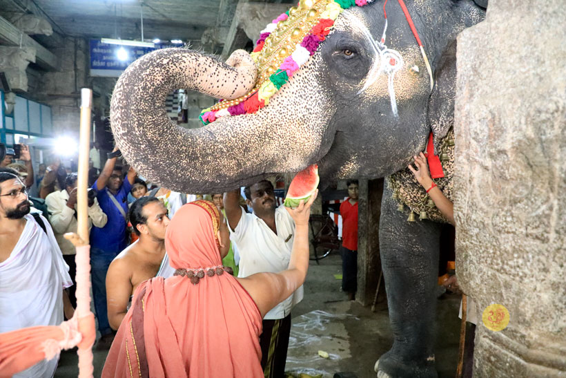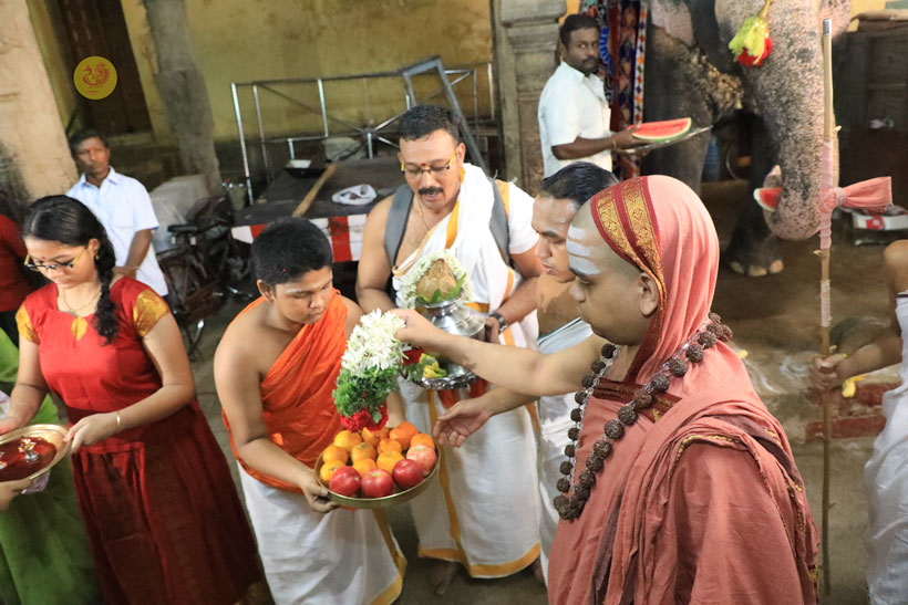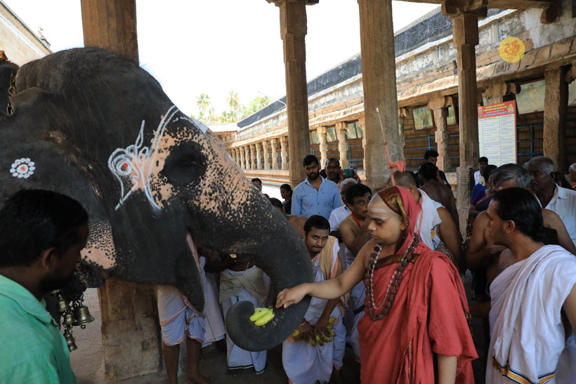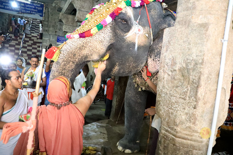 On May 11, Sri Mahasannidhanam and Sri Sannidhanam had Darshan at the famous temple of Tirunavanaikaval. The Jagadgurus were received with Poornakumbha Swagata at the entrance of the huge temple. After having Darshan of Sri Prasanna Vinayakar, the Jagadgurus had Darshan of Goddess Akhilandeshwari and Lord Jambukeshwarar (the Jala Linga Kshetram amongst the Panchabhoota Shiva Kshetrams).