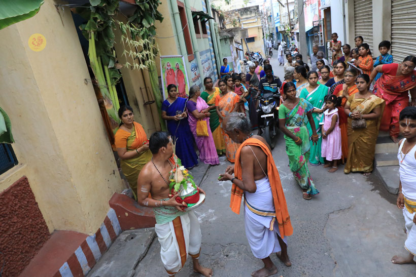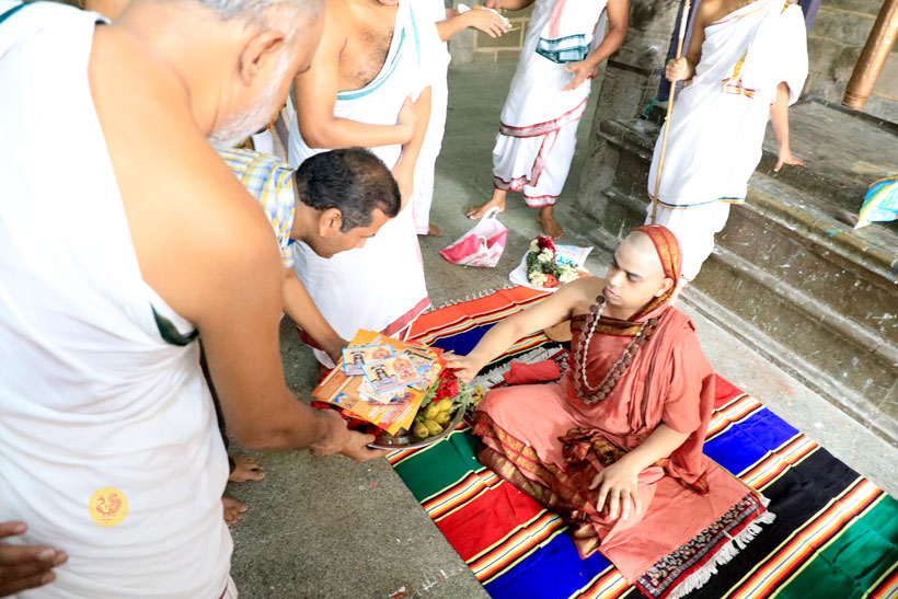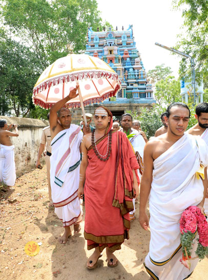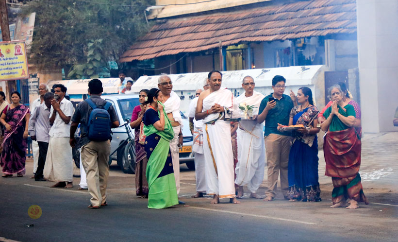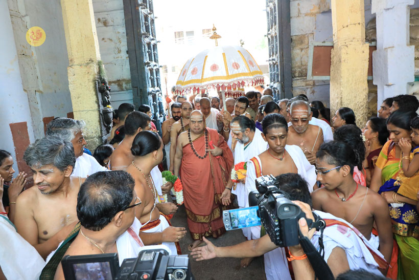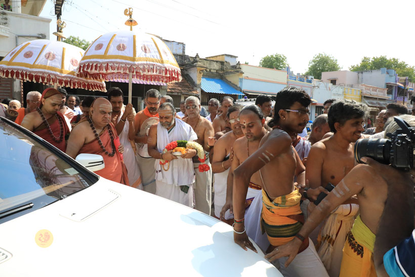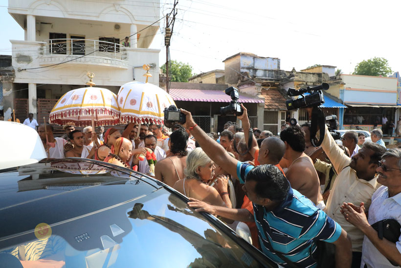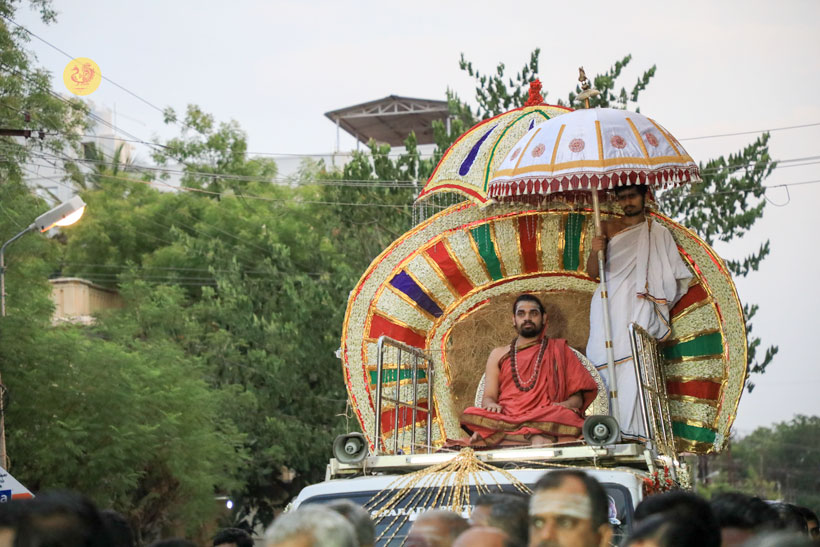 After granting Darshan and blessing devotees with Mantrakshata, the Jagadgurus started in the afternoon from Srirangam towards Pudukkottai.