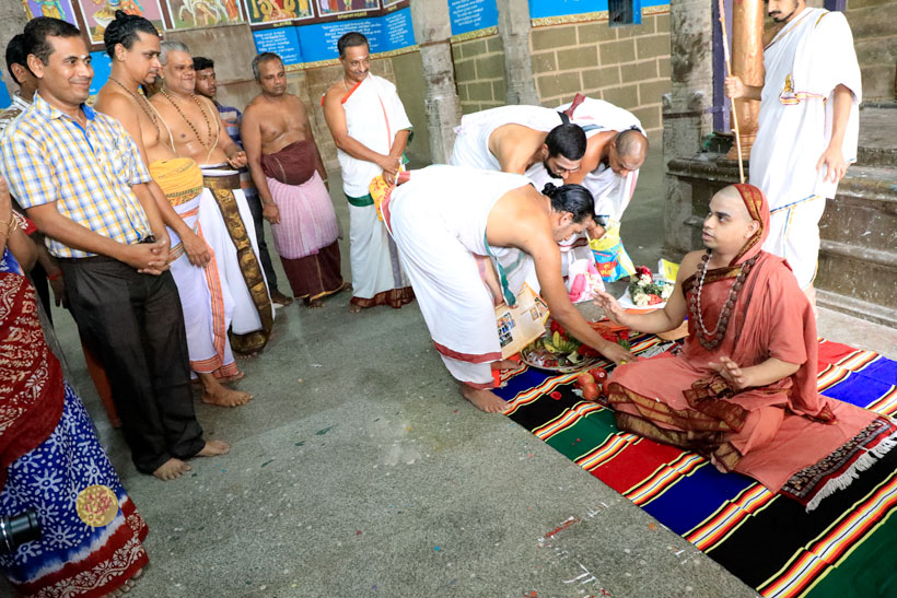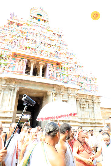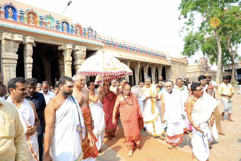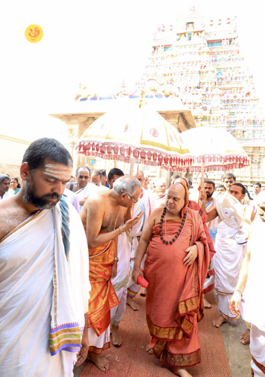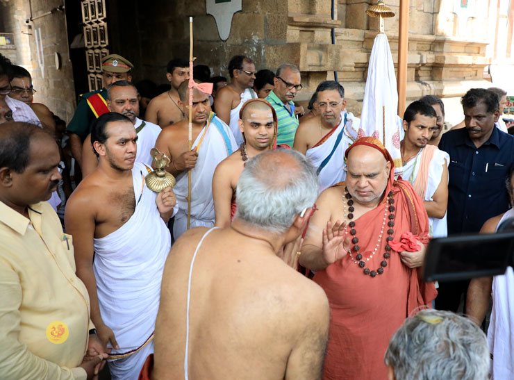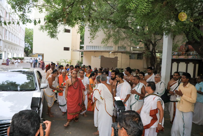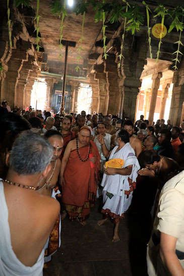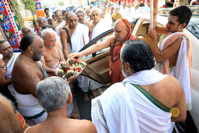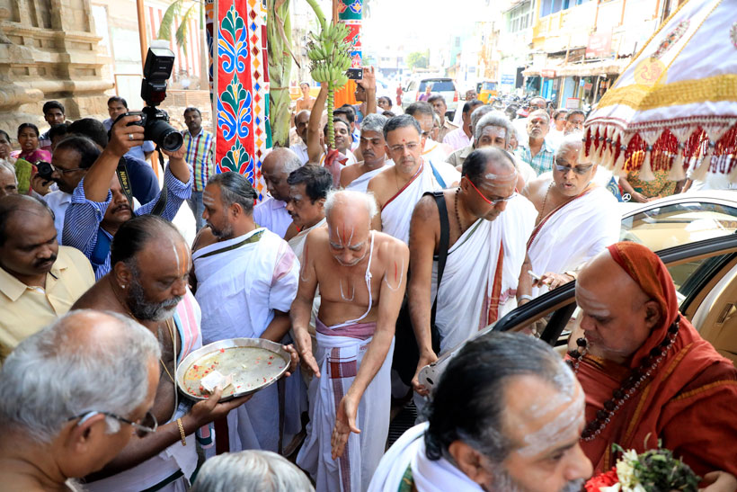 Later that morning, the Jagadgurus arrived at the entrance of the famous Ranganatha Swamy temple of Srirangam to a respectful Swagata with Poornakumbha by Archakas and temple authorities headed by Chairman of the Temple Board, Sri Venu Srinivasan and Joint Commissioner, Sri P Jayaraman. After having Darshan of the huge Vigraha of Sri Garuda, the Jagadgurus had Darshan of Lord Ranganatha and Goddess Ranganayaki.