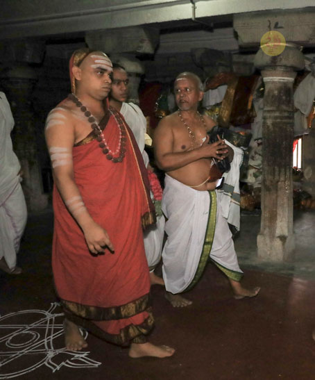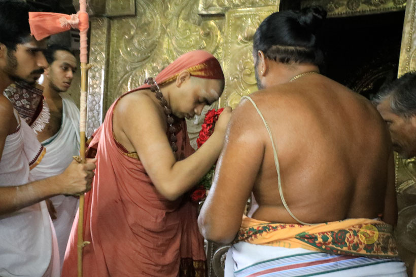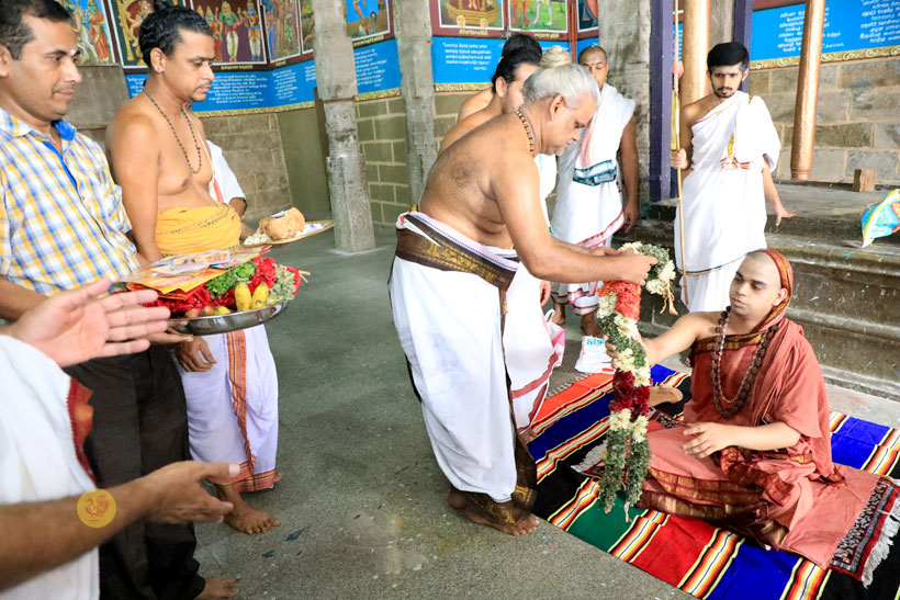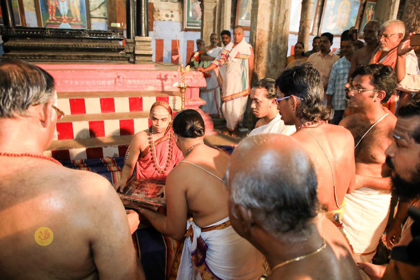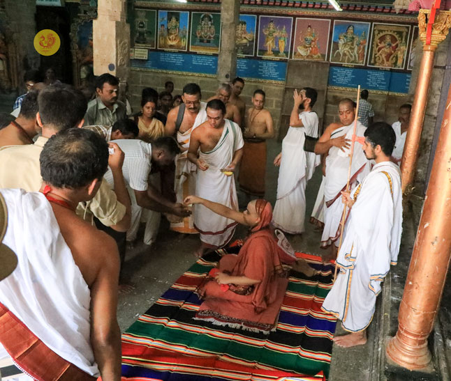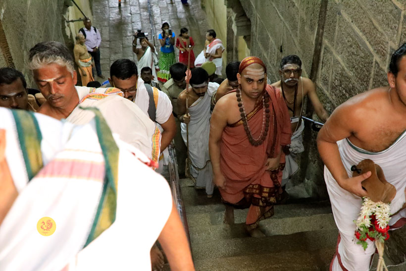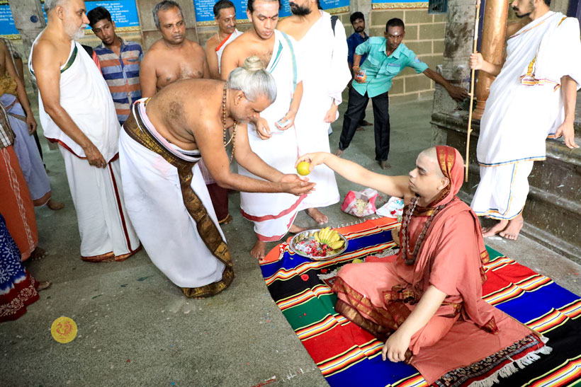 Later that morning, the Jagadgurus arrived at the entrance of the famous Ranganatha Swamy temple of Srirangam to a respectful Swagata with Poornakumbha by Archakas and temple authorities headed by Chairman of the Temple Board, Sri Venu Srinivasan and Joint Commissioner, Sri P Jayaraman. After having Darshan of the huge Vigraha of Sri Garuda, the Jagadgurus had Darshan of Lord Ranganatha and Goddess Ranganayaki.
