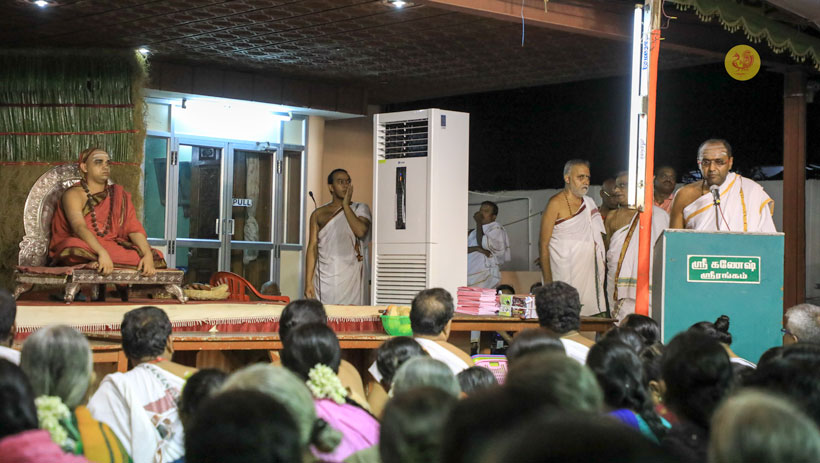 Sri Mahasannidhanam in His Anugraha Bhashanam remembered that His Parameshti Guru Jagadguru Sri Sacchidananda Shivabhinava Nrisimha Bharati Mahaswamiji had showered His Blessings on Sri T K Balasubrahmanya Iyer for the establishment of the Sringeri Shankara Math. Since then, both the Acharya Vidya Peetham and the then Vani Vilas Press functioned and engaged in the spread of Sanatana Dharma. Sri Mahasannidhanam then quoted a Vedic Mantra “श्रद्धा सत्यं धर्मश्चैतानि मा मा हासिषुः – “May Shraddha (faith in the words of the Shastras and Guru), Satya (adherence to speaking truth) and Dharma (the cause of welfare in this world and the next) never leave me.” Sri Mahasannidhanam then praised the tradition of devotion towards the Sringeri Jagadgurus amongst the residents of Srirangam and expressed joy over coming to Srirangam along with His Disciple, Sri Sannidhanam.