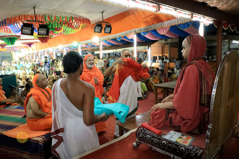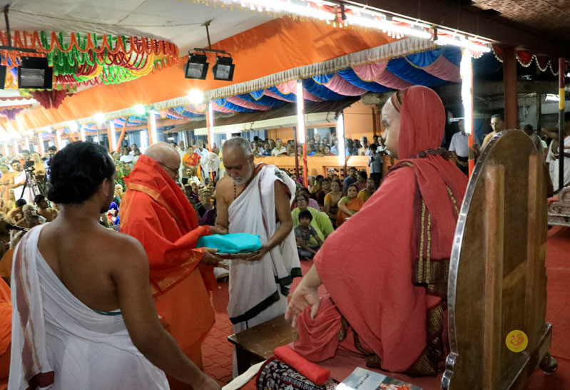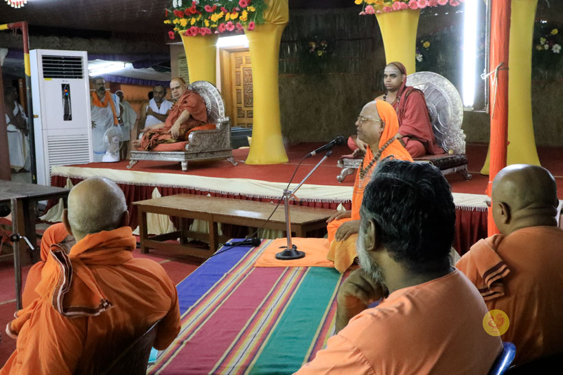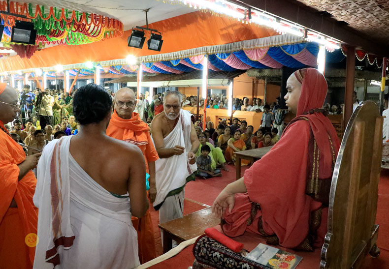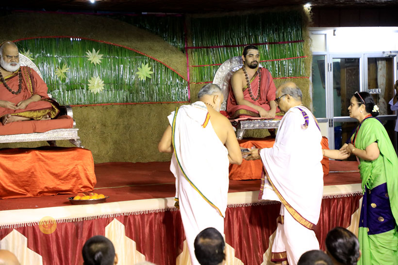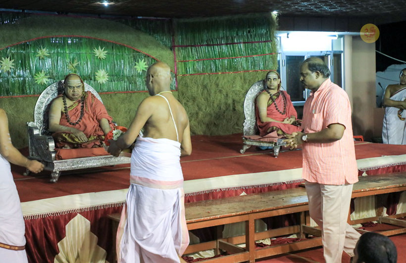 Dhuli Pada Puja was performed by the Manager of Sringeri Shankara Math, Sri Rangarajan. After Veda Ghosha and prayer (Vidhimukhambhoja Hamsi Sharade), a Sanskrit Swagata Patrika was read and submitted to the Jagadgurus.
