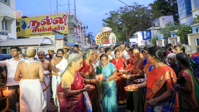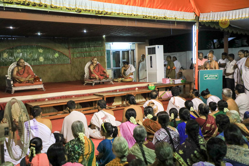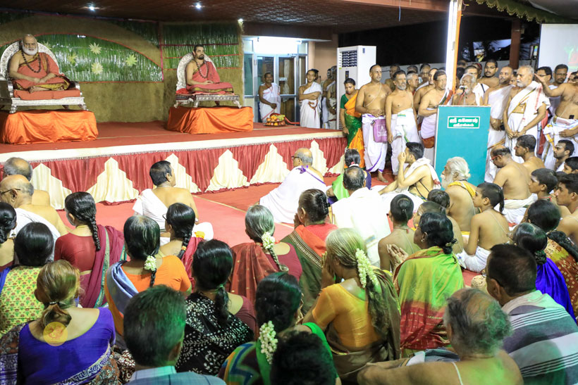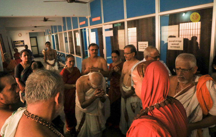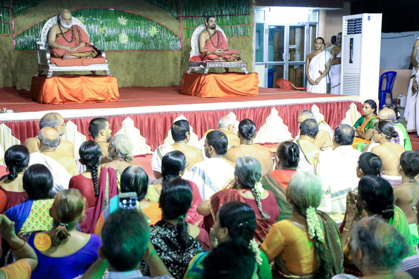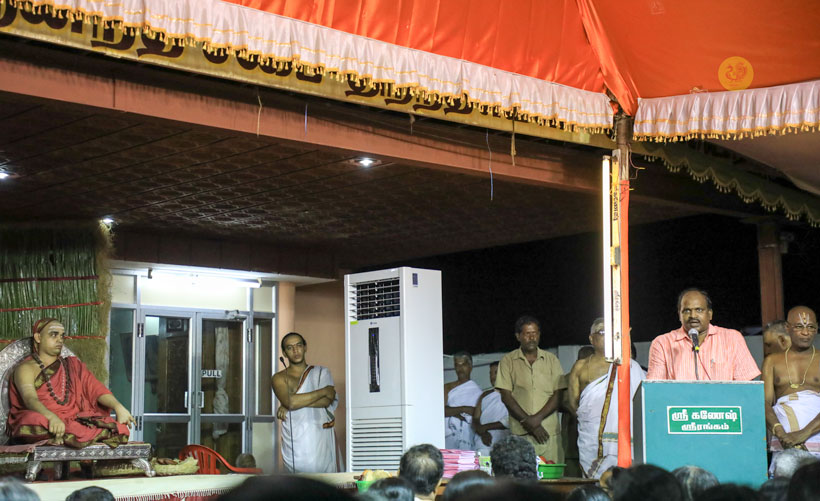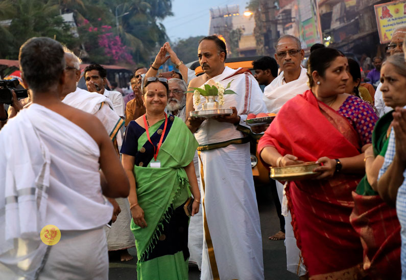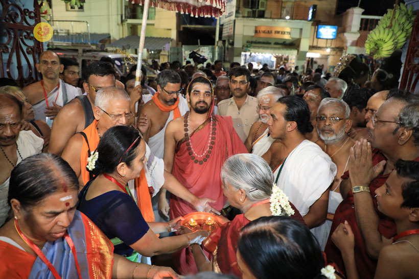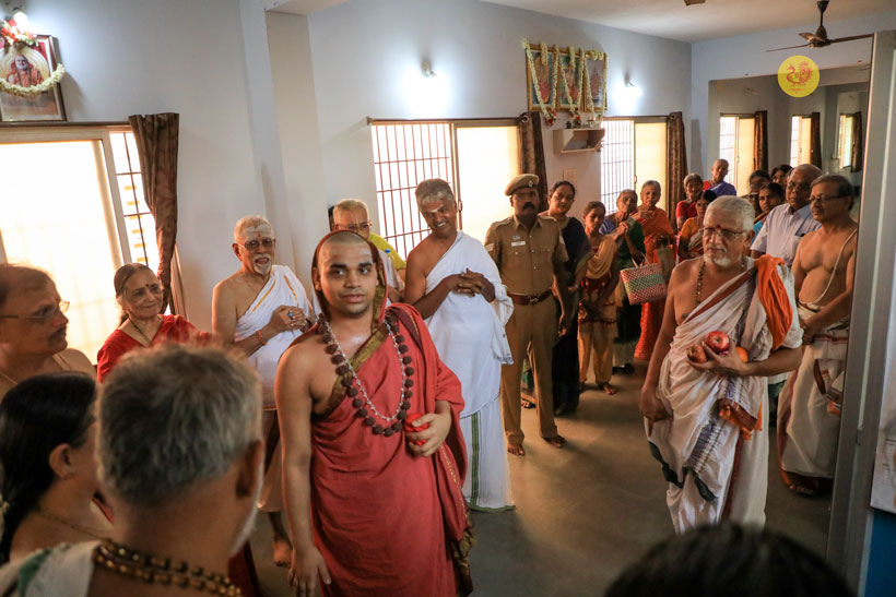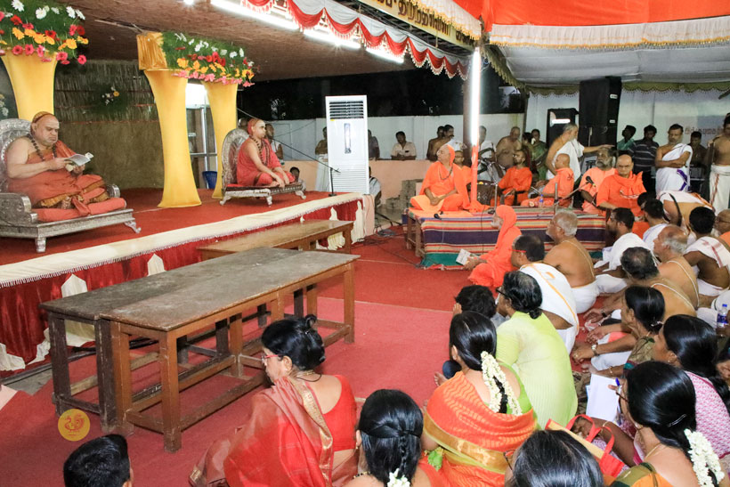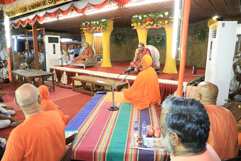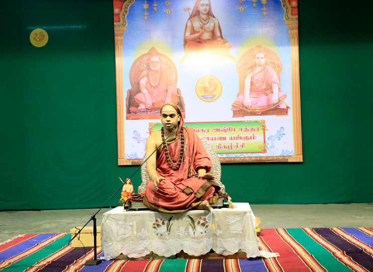 Following this, Sri Sannidhanam graced a program organised by the Tiruchi devotees participating in the Adi Shankaracharya Ashtottara Shata Nama Paryana Yajna. The program that took place in the premises of the Shrimati Indira Gandhi College in Tiruchirapalli. Many hundreds of devotees chanted the Ashtottara. Sri Sannidhanam blessed the gathering with an Anugraha Bhashanam detailing the significance of the life and teachings of Sri Adi Shankaracharya for all followers of Sanatana Dharma.