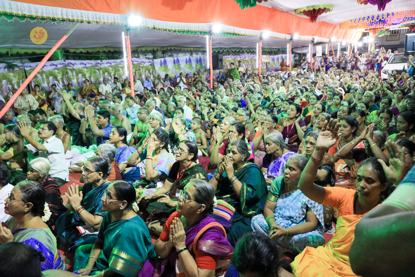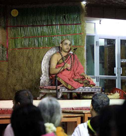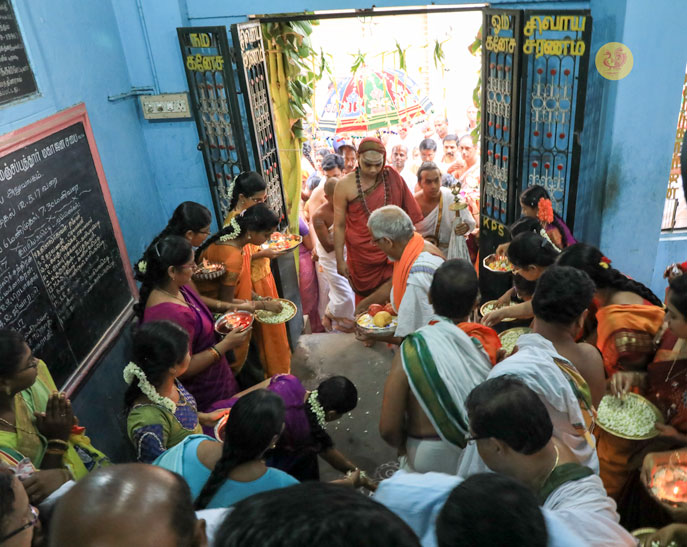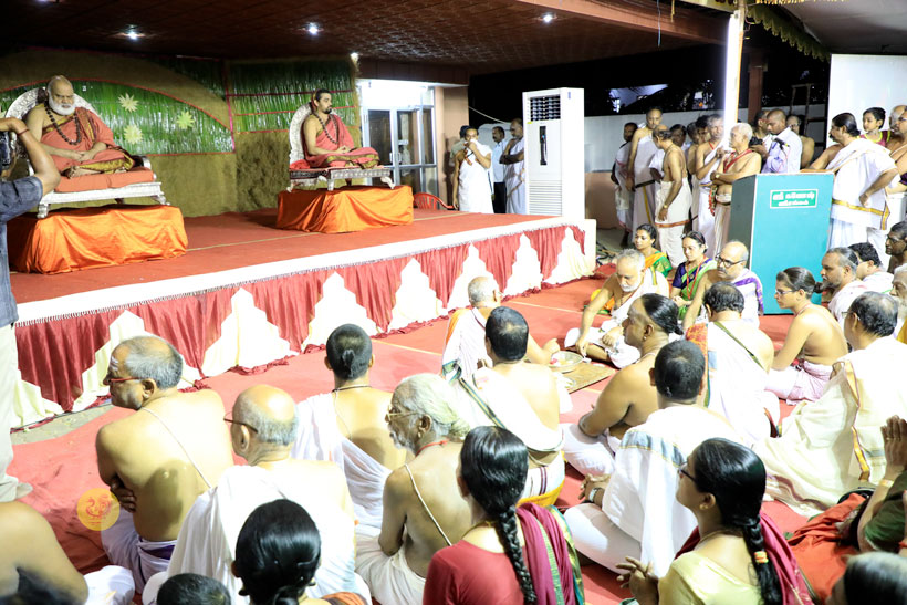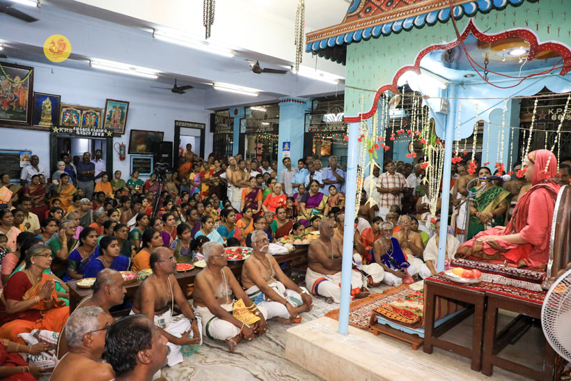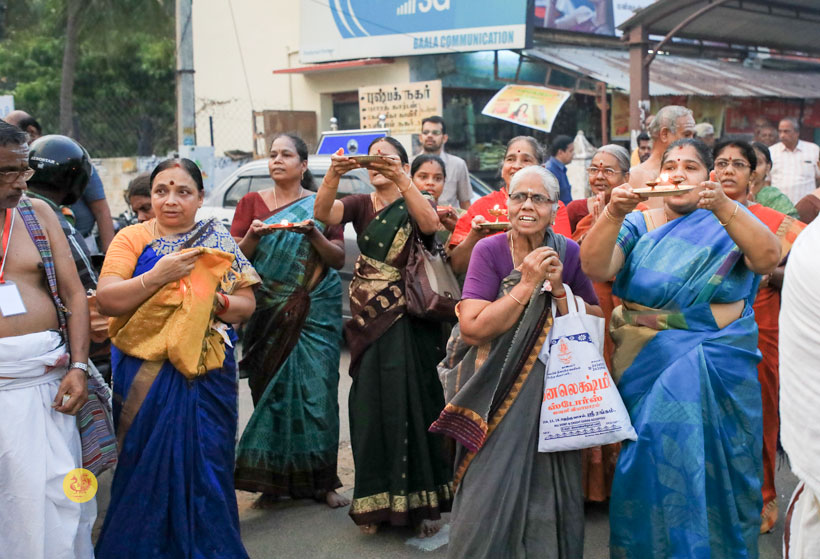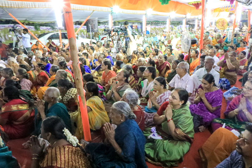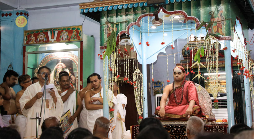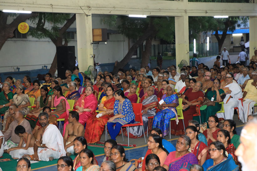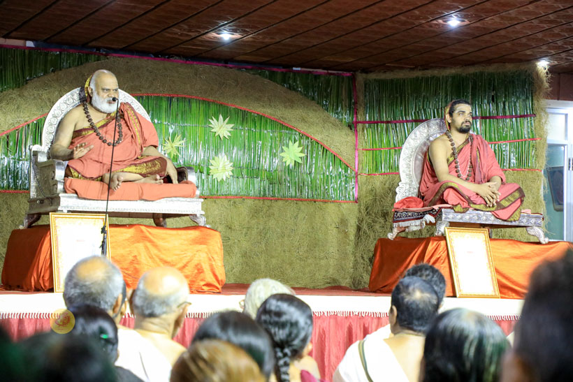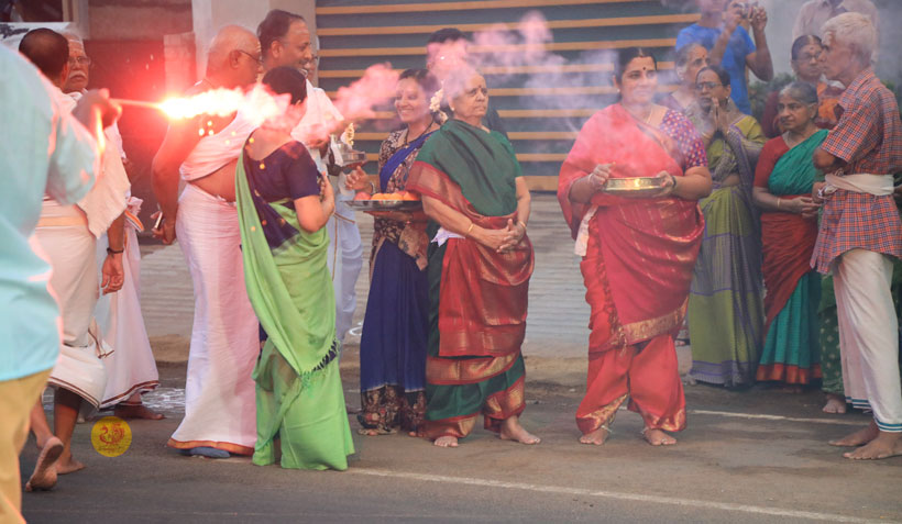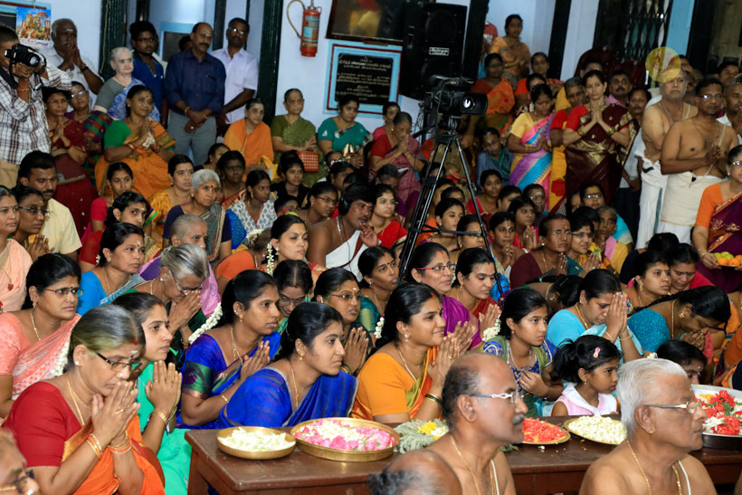 Following this, Sri Sannidhanam graced a program organised by the Tiruchi devotees participating in the Adi Shankaracharya Ashtottara Shata Nama Paryana Yajna. The program that took place in the premises of the Shrimati Indira Gandhi College in Tiruchirapalli. Many hundreds of devotees chanted the Ashtottara. Sri Sannidhanam blessed the gathering with an Anugraha Bhashanam detailing the significance of the life and teachings of Sri Adi Shankaracharya for all followers of Sanatana Dharma.