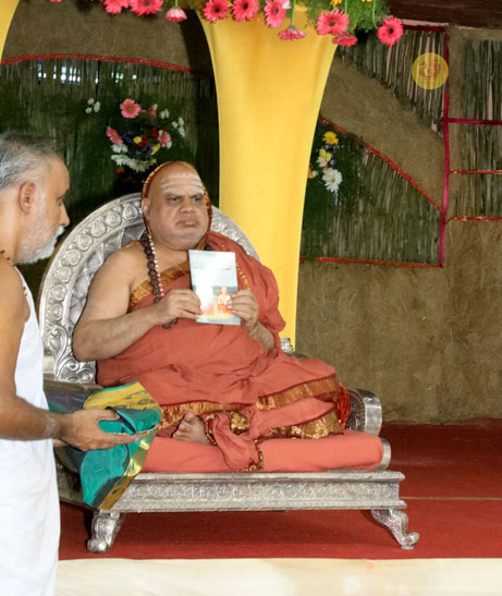 In the evening, a Guru Vandana Program was organised in the premises of the Peetham. Sri K Vidyashankar of MM Forgings spoke on the occasion extolling the virtues of the Sringeri Jagadgurus and sought Their Anugraha at all times. Sri P Jayaraman, Joint Commissioner of the famous Sri Ranganatha Swamy temple at Srirangam, offered his pranams to the Jagadgurus and spoke on the occasion extending a formal invitation for the Jagadgurus to visit the Ranganathaswamy temple. Smt. Sharada Chityala then talked about the Android app titled “Tunga lahari” containing renditions (along with lyrics) by various renowned artists of the Stotras of Sri Bhagavatpada and the compositions of the Sringeri Jagadgurus. This free app was then released by Sri Mahasannidhanam and is available at the Math’s App Store. A Tamil book titled “Sri Sharada Antyaadi” was also released by Sri Mahasannidhanam.