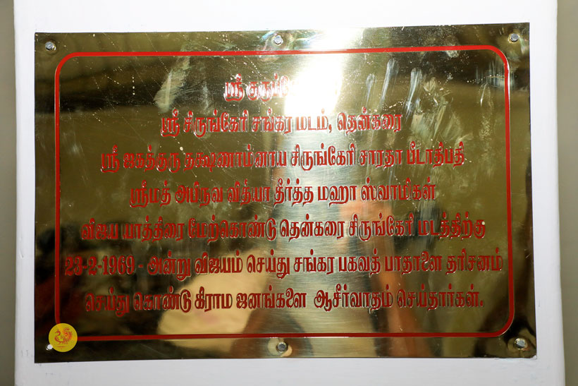 On arrival at Thenkarai, the Jagadgurus had Darshan of the Murti of Sri Adi Shankaracharya at the Sringeri Shankara Math. After Dhuli Pada Puja was performed by Sri V Vaidyanathan, the Sabha to welcome the Jagadgurus began with Veda Ghosha and a prayer song by Smt. Sharada Ramanan. After a citation in poetic Tamil was offered to the Jagadgurus welcoming them, the Acharyas blessed the gathering with Anugraha Bhashanams.
