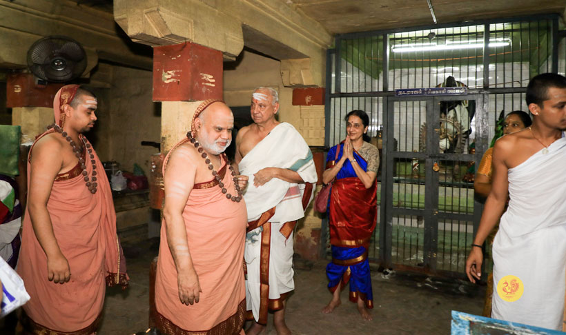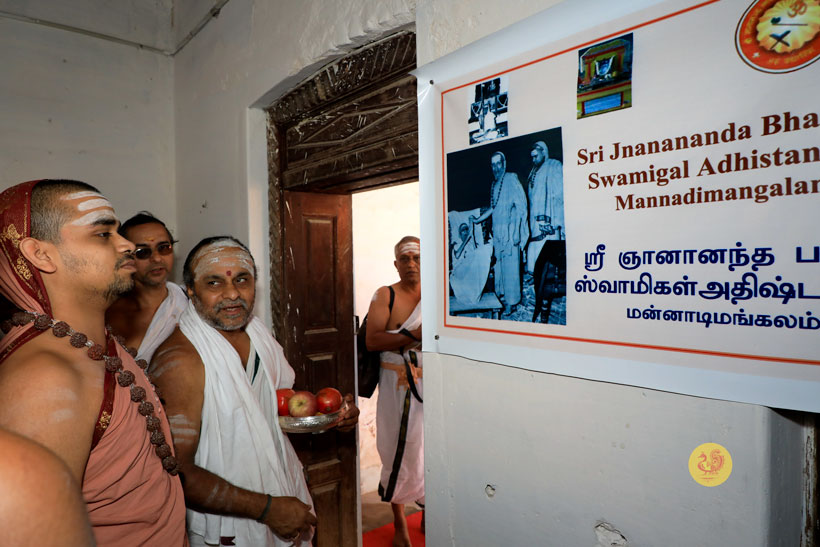 The following morning, Sri Sannidhanam visited the century old temple of Vishalakshi Sameta Kashi Vishweshwara Swamy temple at Mullipallam. Sri Sannidhanam also visited Mannadimangalam, where He blessed the renovation efforts of the Adhishtanam of Sri Jnanananda Bharati Swamigal (Sri R Krishnaswamy Iyer in Poorvashrama).