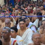 In the evening, a public function was held in the Jagadguru’s divine presence to commemorate the Kumbhabhisheka. At the start of the Sabha, Sri Nagai Mukudan, who had earlier given a discourse on the grace of the Guru and the Lord, spoke about the Jagadguru’s practical advice of countering anger by laughter. Sringeri Shankara Math branch head, Sri Anantha Srinivasan and elderly devotee Sri Swamikulathu Iyer spoke on the occasion submitting their Pranams to the Jagadguru.