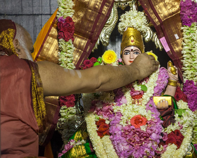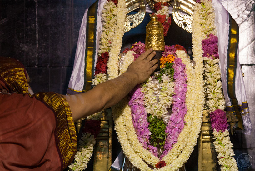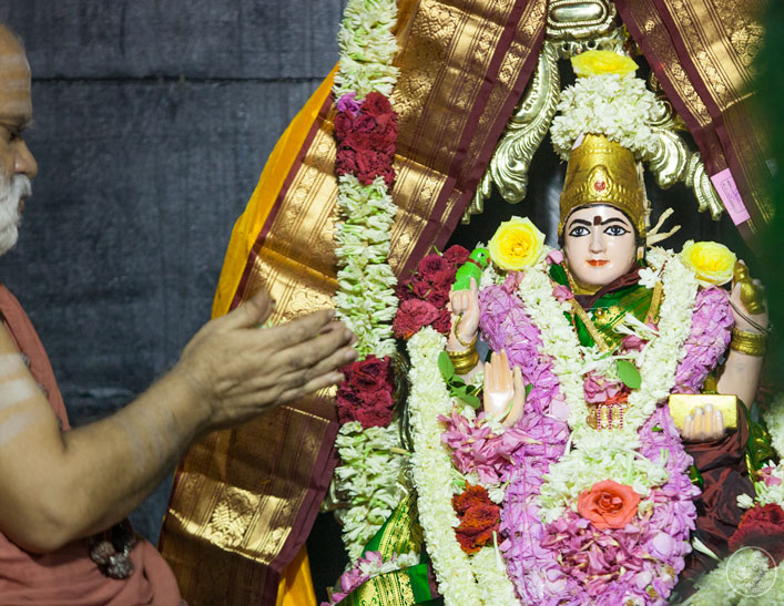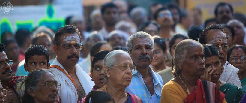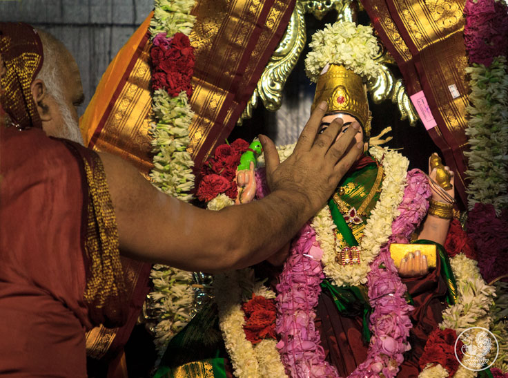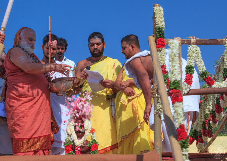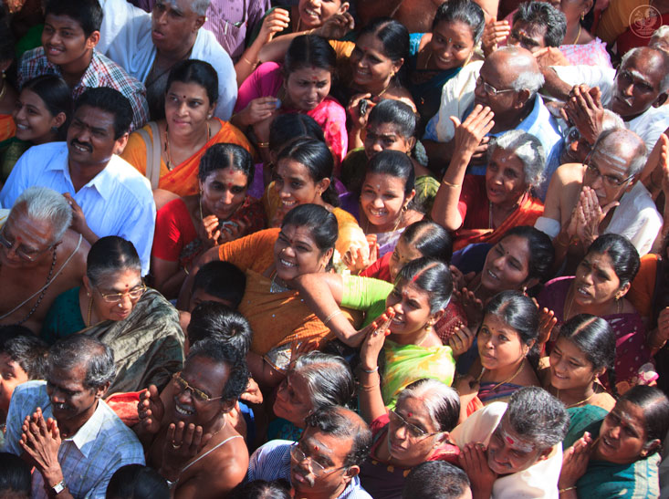 On the evening of 2nd May 2012, the Jagadguru was offered Poornakumbha at the entrance of Sri Shankara Rameswarar temple. The Jagadguru then graced the Bhajana Madam, and gave an Anugraha Bhashanam to bless the devotees at the nearby Jayashri Kalyana Mandapam. The Jagadguru talked about the qualities of a true devotee as described by the Lord in the Gita – that he would hate no living being, be compassionate and friendly to all, be without the sense of I and mine, and equanimous in the midst of joy and sorrow. Quoting a verse, the Jagadguru said that the Lord is pleased only by a devotee who is humbler than a blade of grass and more tolerant than a tree –