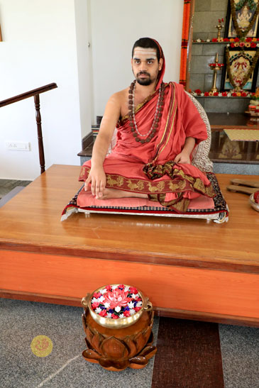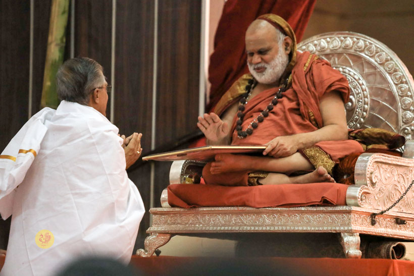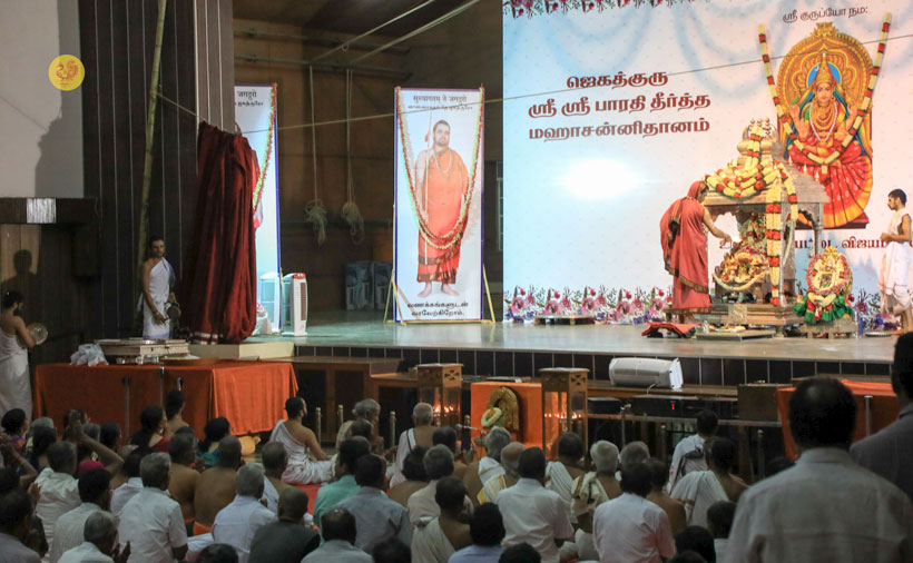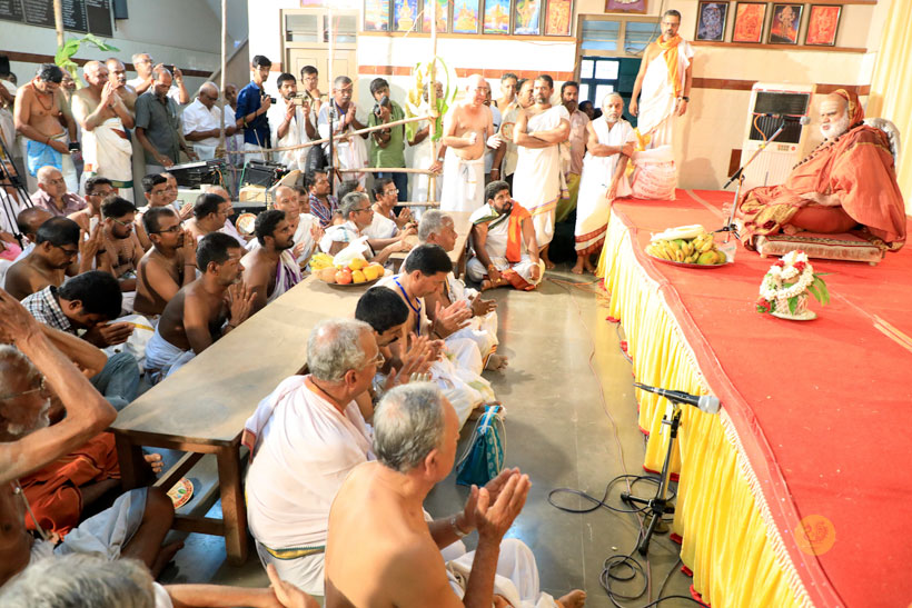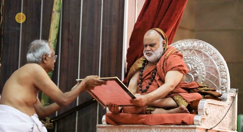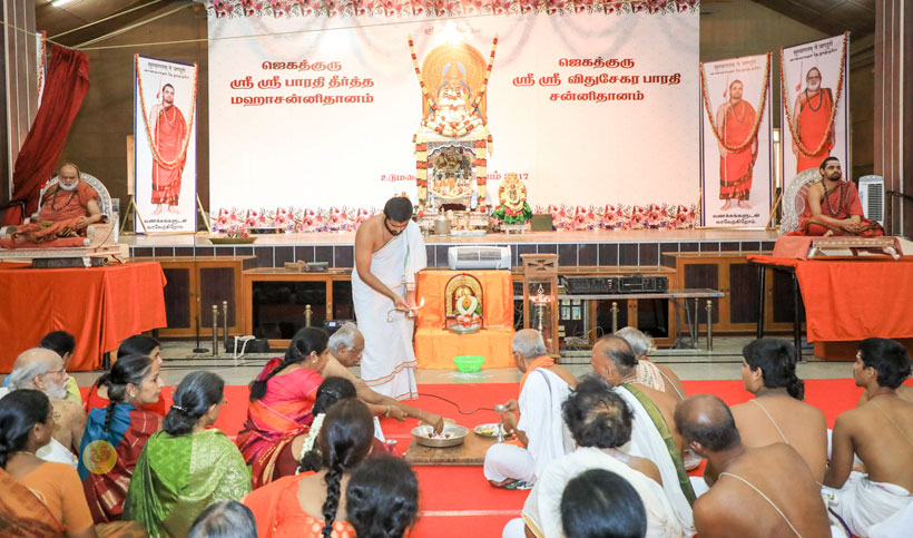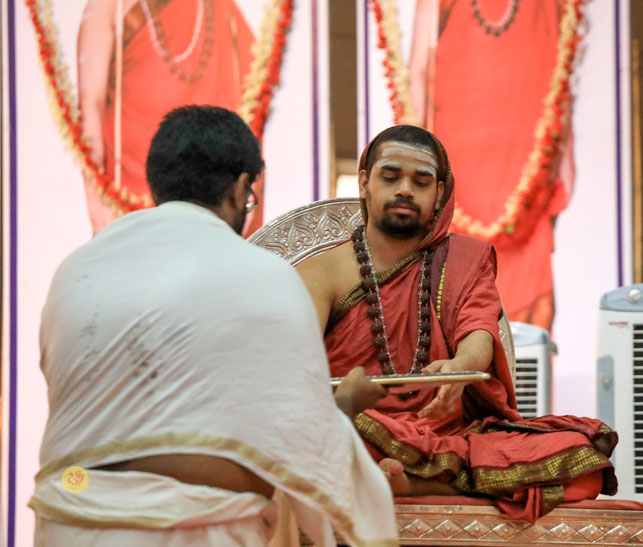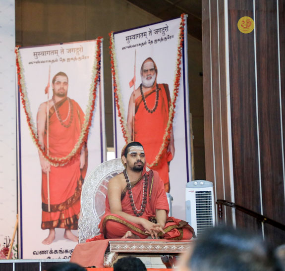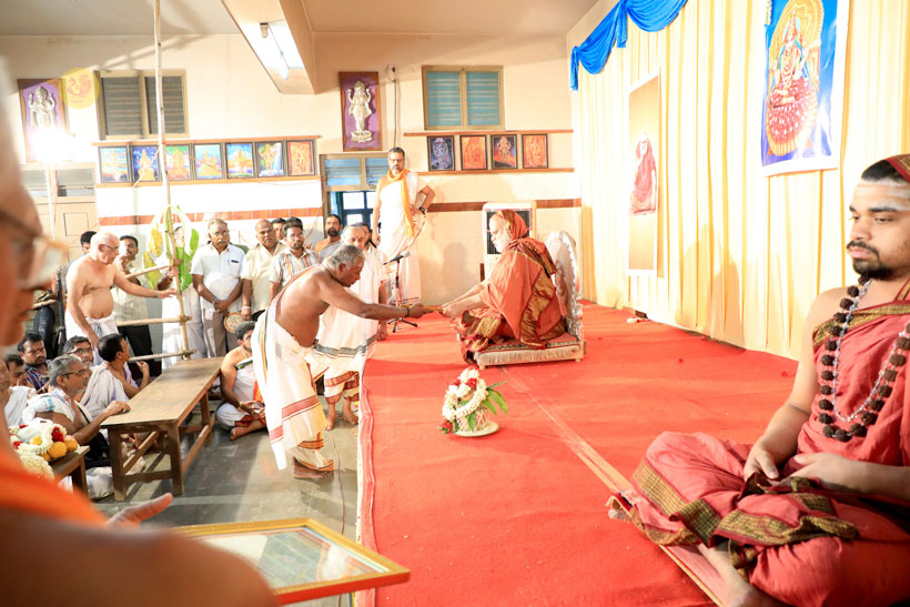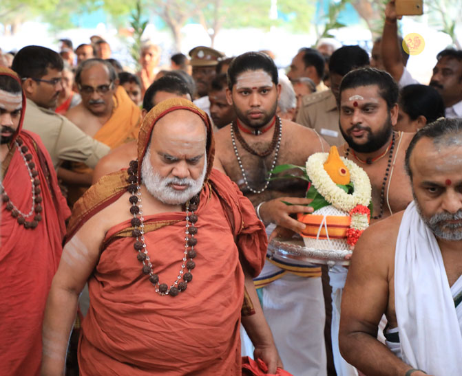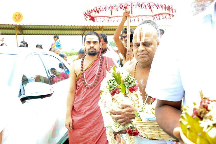 Sri Mahasannidhanam and Sri Sannidhanam arrived at Udumalaipettai to a devout welcome on April 23, 2017 at around 6 pm. After Dhuli Pada Pooja and Veda Ghosha, a Tamil Swagata Patrika  welcoming the Jagadgurus to Udumalaipettai were read out and offered to the Jagadgurus.