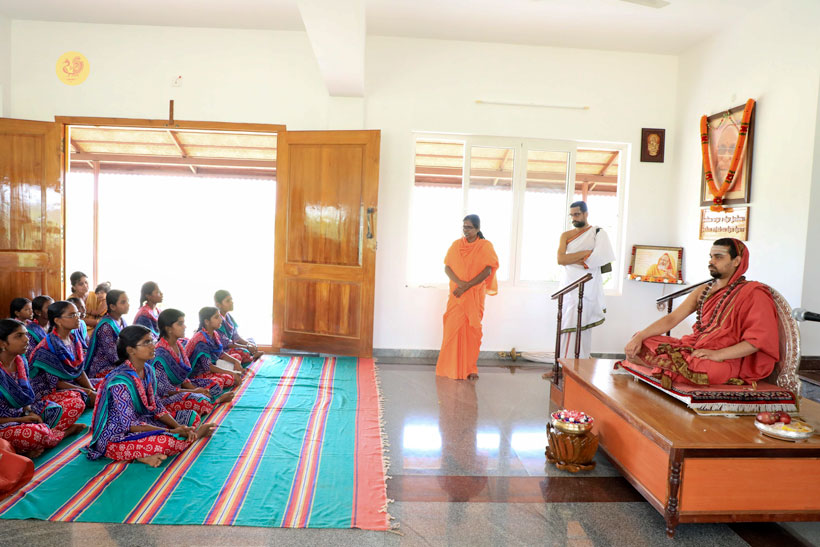 On the morning of April 24, 2017, Sri Sannidhanam graced the Atmalayam  Swami Dayananda Aim for Seva Free student home in Udumalaipettai. The home supports the education of many needy girls in the vicinity and also offers vocational training. Swamini Gurupriyananda Saraswati reverentially welcomed Sri Sannidhanam and remembered how Swami Dayananada Saraswati always referred to the Sringeri Jagadgurus as the ideal Peethadhipatis and upholders of the Sampradaya of Vedanta. Sri Sannidhanam blessed the gathering with an Anugraha Bhashanam.