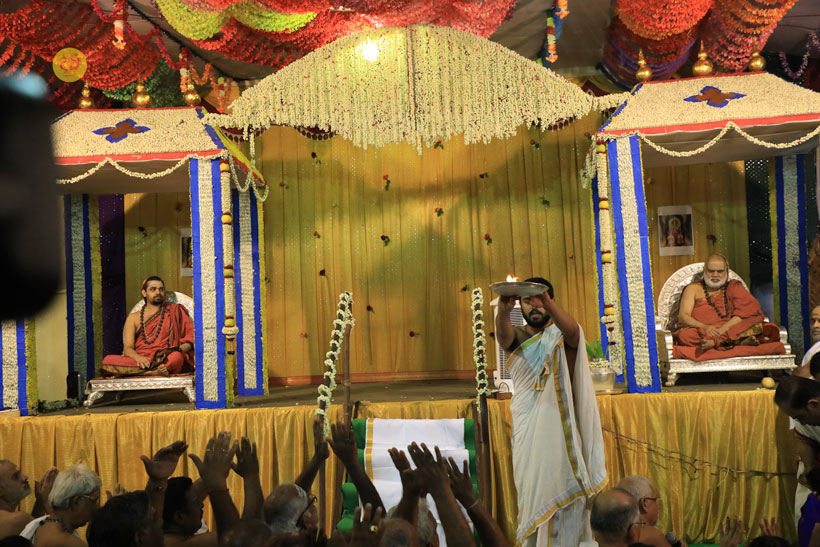Sri Mahasannidhanam in His Anugraha Bhashanam talked about the greatness of Sri Adi Shankaracharya. Sri Mahasannidhanam then narrated the story of King Dileepa who initially disrespected the heavenly cow Kamadhenu and then diligently served Kamandhenu’s calf Nandini. Sri Mahasannidhanam said that one must never disrespect Mahatmas who have shown us the path of welfare, and must remain grateful to them.