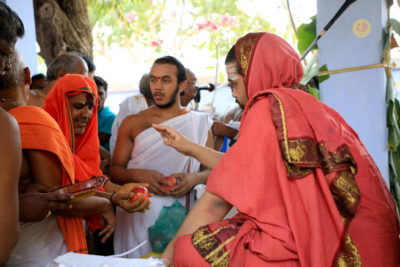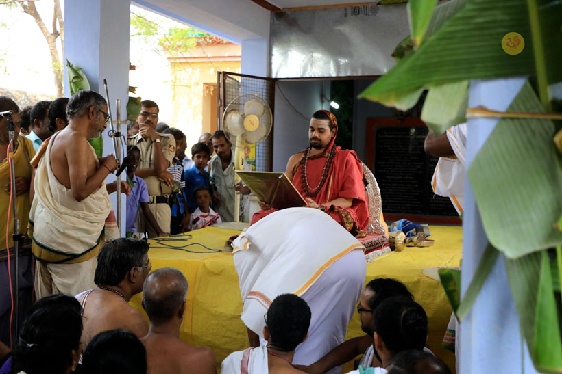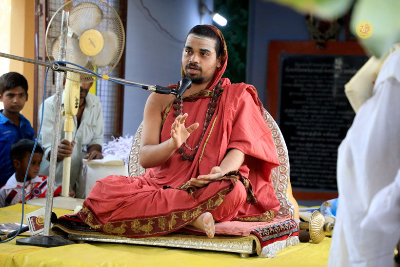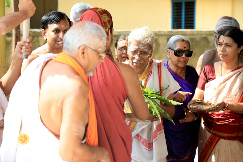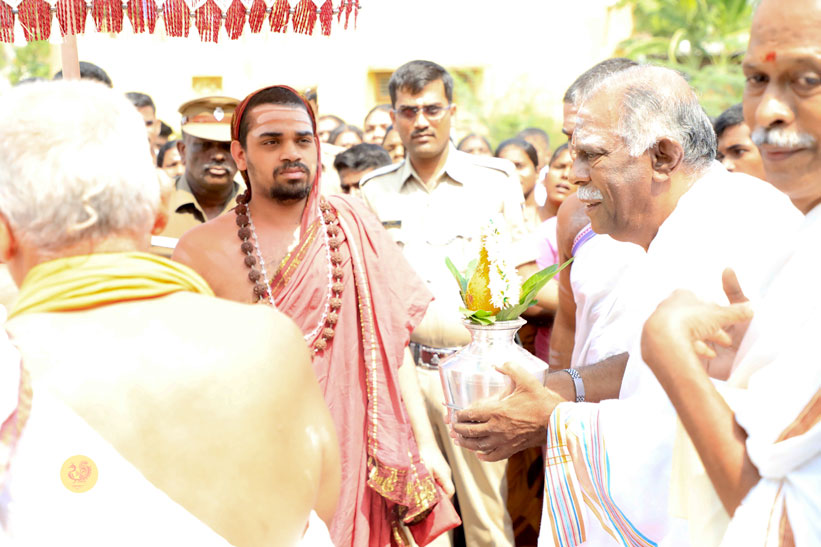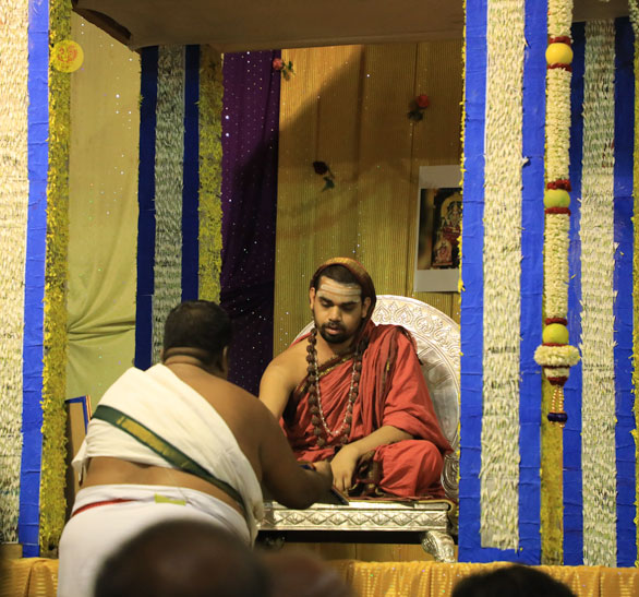 Sri Mahasannidhanam and Sri Sannidhanam arrived at Vathalagundu in the evening of April 20, 2017 to a reverential welcome. In His Anugraha Bhashanam, Sri Sannidhanam said that man’s desires must be regulated by Dharma as instructed by the Lord – धर्माऽविरुद्धो भूतेषु कामोस्मि भरतर्षभ. Sri Sannidhanam explained that man must engage in action to fill his stomach, eat to sustain his body, and use the fit body to seek the Truth – the Truth which liberates from being born again into this ocean of Samsara –