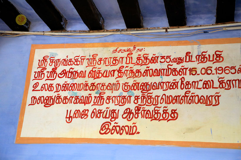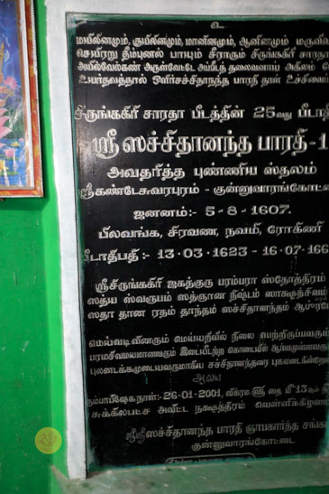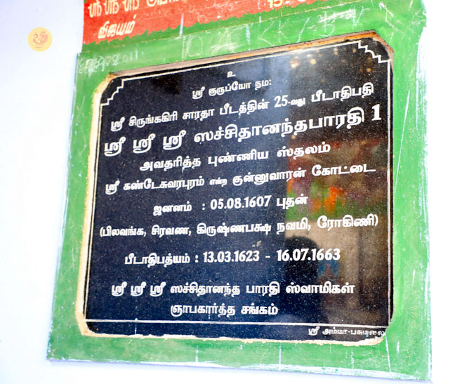 Thereafter Sri Sannidhanam visited the town of Kunnuvarankottai, the birthplace of Jagadguru Sri Sacchidananda Bharati, the 25th Acharya of the Peetham. Sri Sannidhanam first visited the Sri Sri Sri Sacchidananda Bharati Swamigal Dhyana Mandapam and then had Darshan at the Vishalakshi Vishwanathar temple. Devotees conducted a public function in the temple premises to welcome the Jagadguru. Sri Sannidhanam blessed the devotees with an Anugraha Bhashanam. In His Anugraha Bhashanam given on the occasion, Sri Sannidhanam stated that it is most apt to revere a Mahatma by consecrating His birthplace. Sri Sannidhanam then proceeded to narrate that recently, work had been taking place at the birthplace of His Guru, Sri Mahasannidhanam, in Machilipatnam in Andhra Pradesh. To the amazement of all, Sri Sannidhanam revealed that as the land was being dug to lay the foundation for a proposed structure at the place, an ancient Vigraha of Sri Anjaneya has been found. This is indicative of the fact that the very birthplace of Mahatmas happens at holy spots. These spots will then have to be revered. Sri Sannidhanam praised the residents of the village for constructing a Dhyana Mandapam in memory of the 25th Sringeri Acharya, and blessed the assembled gathering.